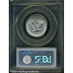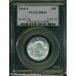 1918-S 25C MS64 PCGS. The 1918-S is a better date <B>1918-S 25C MS64 PCGS.</B></I> The 1918-S is a better date among early Standing Liberty quarters. Slightly soft on the date, the shield, and Liberty's head, but generally well struck elsewhere, this satiny near-Gem is bright and untoned, with unmarked surfaces that show a number of wispy die polish lines (as struck) on the reverse. A really pretty near-Gem. Population: 133 in 64, 71 finer (11/04). <BR><BR><B>Important notice:</B> Heritage usually auctions material at the rate of 200-250 lots per hour. On some occasions eBay Live bid software or the Internet may not be able to keep up with the pace of the auction. We recommend placing a realistic absentee bid now as insurance to avoid disappointment. Occasionally the auctioneer may eliminate or reject an eBay Live bid, and the auctioneer may also reopen a lot after the close of the eBay live bidding (usually because we missed an audience bid), and may reject your bid even if it shows you as the winning bidder. By bidding via eBay Live, you agree that Heritage may award the lot to another bidder at its sole discretion under the circumstances described above or any other reasonable circumstances. Since eBay bids are not shown to us until we open the lot on the floor, we treat those bids just like floor bids. In most cases the floor responds before the eBay bid is presented to us, due to Internet lag time, so for consistency we have made it a policy that floor bids are always considered first over tie eBay live bids. Also please note that all Heritage lots purchased through eBay Live carry a 20% Buyer's Premium. Please make sure you read the Terms and Conditions before you bid. This lot is being auctioned in conjunction with a live floor auction by Heritage Galleries & Auctioneers. All final auction and invoice information will be supplied by Heritage Galleries & Auctioneers, and all other information should be considered preliminary. Lot:5945