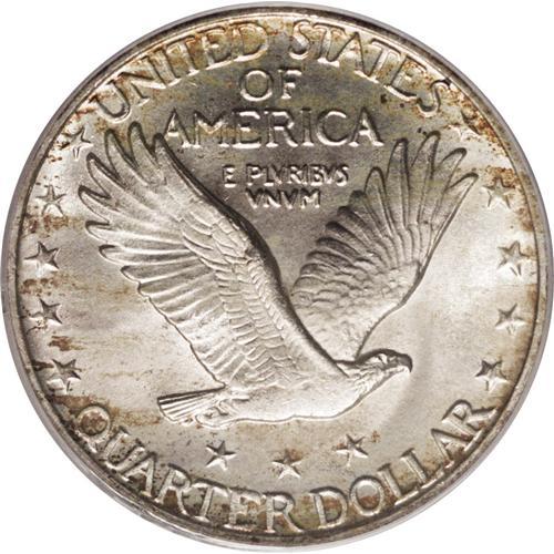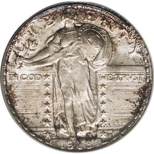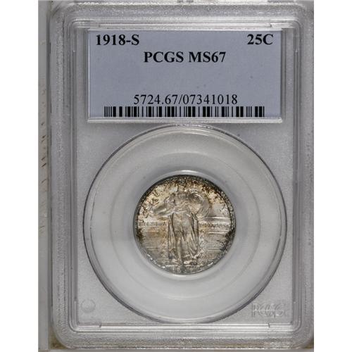 <B>1918-S<25C> MS67 PCGS.</B></I> Wholly original and strictly of the highest visual quality, with specks of dark reddish-brown toning framing the obverse and a lighter shade of reddish-tan streaking the reverse. Sky-blue and salmon toning is also noted on the obverse. The bright, highly lustrous surfaces are near-pristine. This is a better date among early Standing Liberty quarters, and this Superb Gem is the single highest-graded example at PCGS. Population: 1 in 67, 0 finer (9/06).