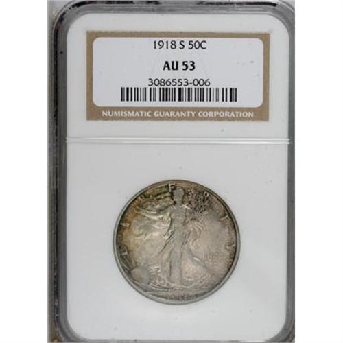 <B>1918-S 50C AU53 NGC.</B></I> NGC Census: (10/582). PCGS Population (23/698). Mintage: 10,282,000. Numismedia Wsl. Price for NGC/PCGS coin in AU53: $167. (#6576)<BR><BR><B>Coin Engraver:</B> Adolph A. Weinman<BR><BR><b>Shipping:</b> Coins & Currency (<a target="_blank" href="http://www.heritageauctions.com/common/shipping.php">view shipping information</a>)