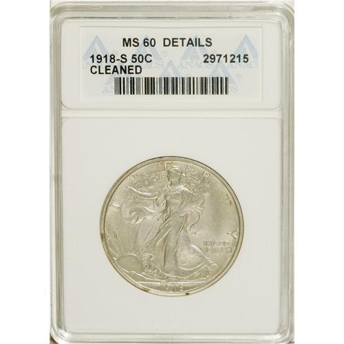 <B>1918-S 50C --Cleaned--ANACS. MS60 Details.</B></I> NGC Census: (8/924). PCGS Population (9/533). Mintage: 10,282,000. Numismedia Wsl. Price for NGC/PCGS coin in MS60: $475. (#6576)<BR><BR><b>Shipping:</b> Coins & Currency (<a target="_blank" href="http://www.heritageauctions.com/common/shipping.php">view shipping information</a>)
