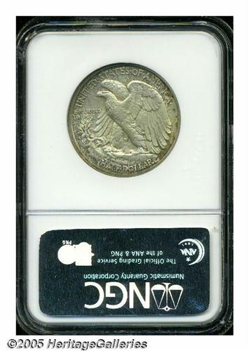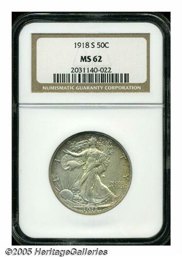 <B>1918-S<50C> MS62 NGC.</B></I> Despite an uncharacteristically high mintage of over ten million pieces, the survival rate of the '18-S half dollar in Mint State is quite low. This example displays typically soft striking details on Liberty's hand and head, somewhat subdued luster and creamy gray-gold patina that yields to attractive, multicolored, speckled patina near the borders, on obverse and reverse. A handful of contact marks are noticeable on the lower obverse, and two or three more are seen on the upper left reverse field.