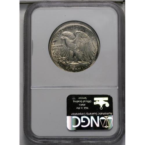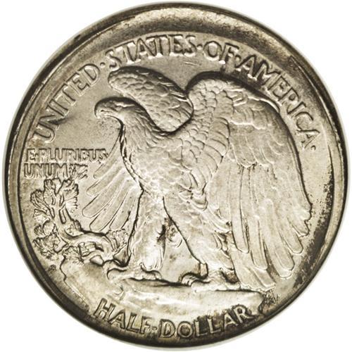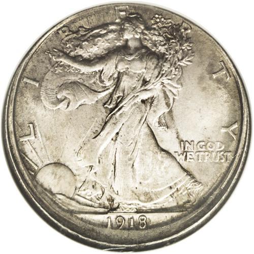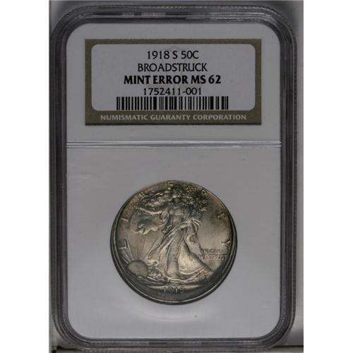<B>1918-S<50C> Walking Liberty Half--Broadstruck--MS62 NGC.</B></I> An off-centered broadstrike that has a 5 to 10% area of unstruck surface centered directly below the date. Broadstruck Walkers are very scarce, and it is especially uncommon to find such an error on an early branch mint issue in Mint State. Because of the broadstrike, Liberty's branch hand has extraordinary definition, and her head is also very sharp. Lustrous and lightly abraded with apricot, pearl-gray, and charcoal colors. <BR><BR><B>Important