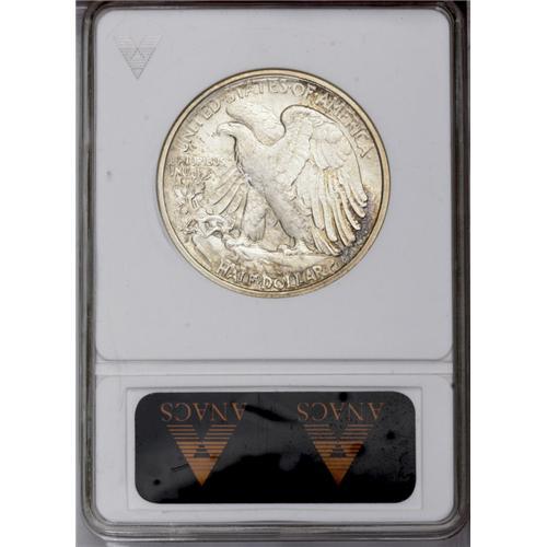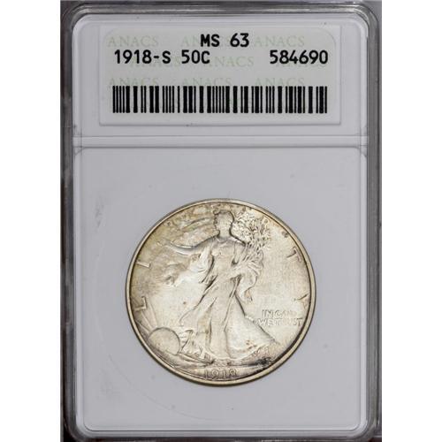 <B>1918-S<50C> MS63 ANACS.</B></I> Somewhat softly detailed on the high points of the obverse and the reverse, but lustrous and attractive with splashes of mustard-yellow toning on the obverse and additional deep lilac on the reverse.