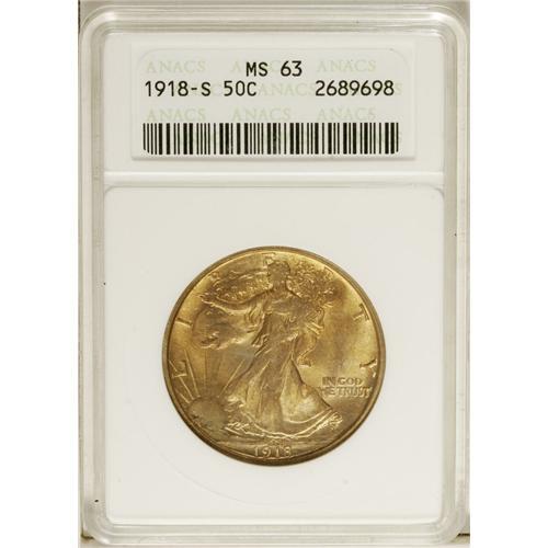 1918-S 50C MS63 ANACS. The obverse has vivid heather a