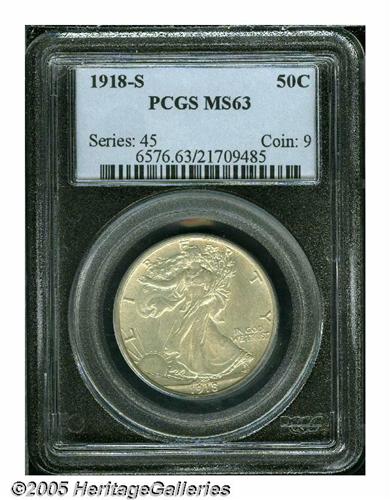 <B>1918-S<50C> MS63 PCGS.</B></I> A lightly toned dove-gray early branch mint Walker with good luster and unusually clean surfaces for the given grade.