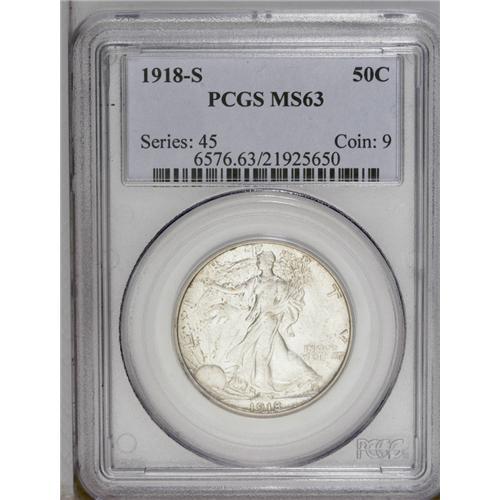 <B>1918-S<50C> MS63 PCGS.</B></I> Lightly toned despite a few peripheral russet freckles. Well preserved for the grade, and the strike is suitable. The dies prominently clashed and were lapped to remove the clash marks, which nonetheless remain obvious on Liberty's extended arm and near IN GOD WE TRUST and AMERICA.