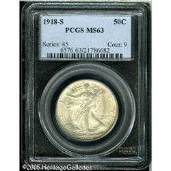 <B>1918-S 50C MS63 PCGS.</B></I> Nearly full brilliance on both sides with frosty white surfaces. The reverse has a couple splashes of deep gold color. Lot:7957