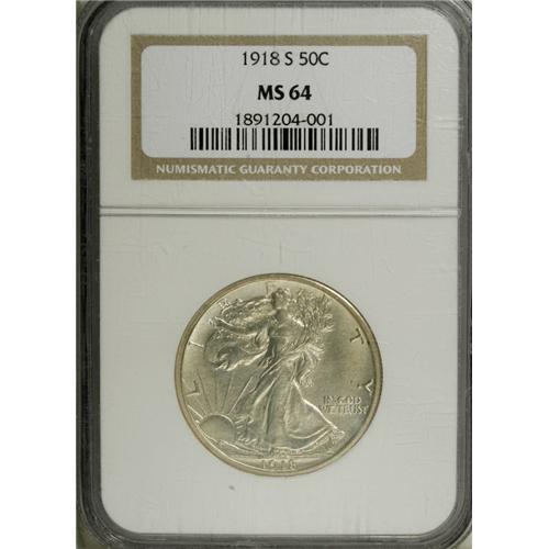 <B>1918-S 50C MS64 NGC.</B></I> A challenging early branch mint issue in the Walking Liberty half dollar series that is most elusive above MS63. This coin has exceptionally clean fields and the strike is exceptional for an '18-S, with only slight softness on Liberty's leg and skirt lines. Nearly untoned, with bright mint luster.<BR><BR><b>Shipping:</b> Coins & Currency (<a target="_blank" href="http://www.heritageauctions.com/common/shipping.php">view shipping information</a>)