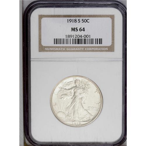 <B>1918-S<50C> MS64 NGC.</B></I> A tough early branch mint issue in the Walking Liberty half dollar series that is most elusive above MS63. This coin has exceptionally clean fields that are nearly without unsightly marks or abrasions. The strike is exceptional for an '18-S, with only slight softness on Liberty's leg and skirt lines. The coin is nearly untoned, with full original luster.