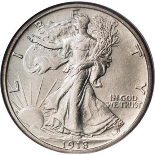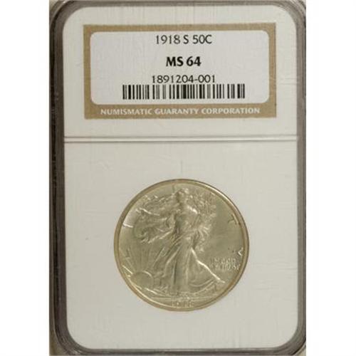 <B>1918-S 50C MS64 NGC.</B></I> The 1918-S is a challenging early branch mint issue in the Walking Liberty half dollar series that is most elusive in grades above MS63. This coin boasts exceptionally clean fields and the strike is superlative for an '18-S, with only slight softness on Liberty's leg and skirt lines. Nearly untoned, with bright mint luster. NGC has certified 37 coins finer (7/07).<BR><BR><B>Coin Engraver:</B> Adolph A. Weinman<BR><BR><b>Shipping:</b> Coins & Currency (<a target="_blank" href="http://www.heritageauctions.com/common/shipping.php">view shipping information</a>\)