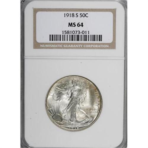 <B>1918-S 50C MS64 NGC.</B></I> While struck in generous quantities, few 1918-S halves were saved. This is an attractive, highly lustrous example that shows the usual slight softness on the central design elements. The surfaces are mostly brilliant with occasional russet-golden color scattered around the margins.<BR><BR><B>Coin Engraver:</B> Adolph A. Weinman<BR><BR><b>Shipping:</b> Coins & Currency (<a target="_blank" href="http://www.heritageauctions.com/common/shipping.php">view shipping information</a>)