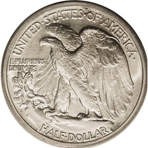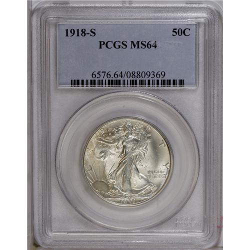 <B>1918-S<50C> MS64 PCGS.</B></I> Essentially brilliant, with milky splashes of lime, tan, and light brown patina. Dazzlingly lustrous, with silky texture covering the fields. A bit softly struck on the high points, as is normal for this date, which becomes much scarcer in higher grades.<BR><I>From The Big Tex Registry Set of Walking Liberty Halves.</B></I>