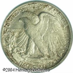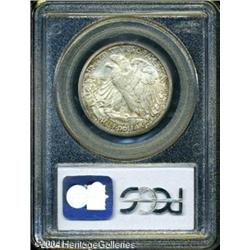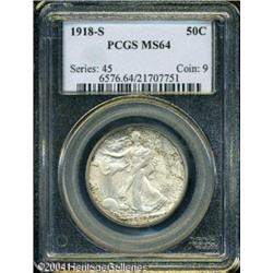 1918-S 50C MS64 PCGS. Extremely well preserved wit <B>1918-S 50C MS64 PCGS.</B></I> Extremely well preserved with a layer of dove-gray patina that is accented with mottled speckles of deep russet-brown color on each side. Some softness shows on the highpoints of the devices, and a couple of tiny marks are noted on Liberty's leg. Despite a high mintage, this early Walking Liberty issue is quite scarce in better Mint State grades. <BR><BR><B>Important notice:</B> Heritage usually auctions material at the rate of 200-250 lots per hour. On some occasions eBay Live bid software or the Internet may not be able to keep up with the pace of the auction. We recommend placing a realistic absentee bid now as insurance to avoid disappointment. Occasionally the auctioneer may eliminate or reject an eBay Live bid, and the auctioneer may also reopen a lot after the close of the eBay live bidding (usually because we missed an audience bid), and may reject your bid even if it shows you as the winning bidder. By bidding via eBay Live, you agree that Heritage may award the lot to another bidder at its sole discretion under the circumstances described above or any other reasonable circumstances. Since eBay bids are not shown to us until we open the lot on the floor, we treat those bids just like floor bids. In most cases the floor responds before the eBay bid is presented to us, due to Internet lag time, so for consistency we have made it a policy that floor bids are always considered first over tie eBay live bids. Also please note that all Heritage lots purchased through eBay Live carry a 20% Buyer's Premium. Please make sure you read the Terms and Conditions before you bid. This lot is being auctioned in conjunction with a live floor auction by Heritage Galleries & Auctioneers. All final auction and invoice information will be supplied by Heritage Galleries & Auctioneers, and all other information should be considered preliminary. Lot:6154