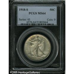 <B>1918-S 50C MS64 PCGS.</B></I> Satiny with decent sharpness for an '18-S Walker and tinges of olive patina here and there. The scarcity of this early S-mint in better Mint State grades defies conventional wisdom, as more than 10 million pieces were originally produced.<BR><I>From The William & Harrison Hiatt Registry Collection, Part Two.</B></I> Lot:7959