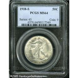 <B>1918-S 50C MS64 PCGS.</B></I> The 1918-S Half Dollar is another example of the many condition scarcities in the Walking Liberty series. More than 10 million pieces were minted, but the location of a near-Gem Uncirculated example can be both time consuming and costly. This remarkable '18-S is notable for its radiant luster and well detailed, frosty devices. A completely untoned appearance and no mentionable faults are also noted. Lot:7958