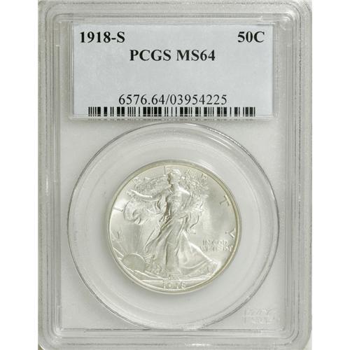 <B>1918-S 50C MS64 PCGS.</B></I> This untoned silver-gray near-Gem displays a lovely sheen of unbroken mint luster across each side. A couple of tiny marks are observed on Liberty's legs, as mint-made die polish lines (on the obverse) and die clash marks (on both sides) are easy to find. Surprisingly scarce in Choice Mint State, despite a high mintage in excess of 10 million pieces, and genuinely scarce any finer.<BR><BR><b>Shipping:</b> Coins & Currency (<a target="_blank" href="http://www.heritageauctions.com/common/shipping.php">view shipping information</a>)