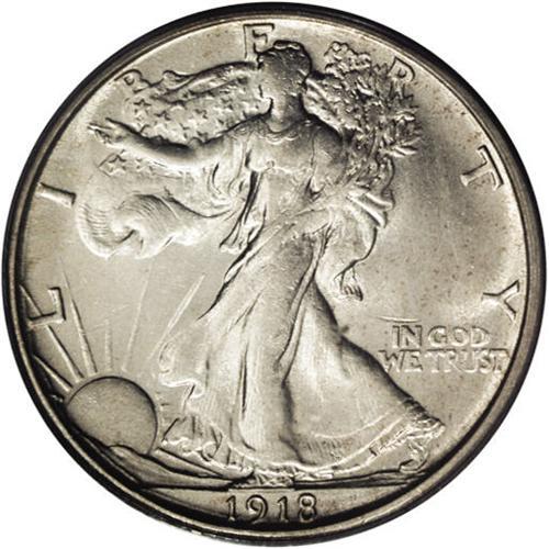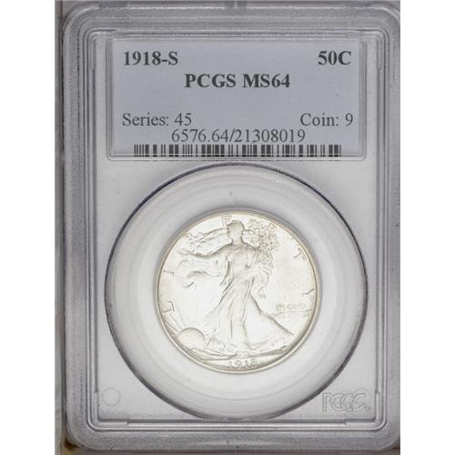<B>1918-S<50C> MS64 PCGS.</B></I> Untoned and satiny with noticeable softness on Liberty's head, while the balance of the coin is especially well detailed. A difficult issue so fine in spite of its large production of more than 10 million pieces. The thick, satiny luster is essentially untoned overall.