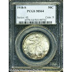 <B>1918-S<50C> MS64 PCGS.</B></I> One of several high grade 1918-S Halves that we are presenting to bidders at Palm Beach, this near-Gem is moderately toned in mottled russet and gray shades on the obverse with an even dove-gray coating on the reverse. Both sides are equally free of outwardly distracting abrasions. Unusually well struck for the issue, and well above average in preservation and overall eye appeal. <BR><BR><B>Important notice:</B> Heritage usually auctions material at the rate of 200-250 lots per hour. On some occasions eBay Live bid software or the Internet may not be able to keep up with the pace of the auction. We recommend placing a realistic absentee bid now as insurance to avoid disappointment. Occasionally the auctioneer may eliminate or reject an eBay Live bid, and the auctioneer may also reopen a lot after the close of the eBay live bidding (usually because we missed an audience bid), and may reject your bid even if it shows you as the winning bidder. By bidding via eBay Live, you agree that Heritage may award the lot to another bidder at its sole discretion under the circumstances described above or any other reasonable circumstances. Since eBay bids are not shown to us until we open the lot on the floor, we treat those bids just like floor bids. In most cases the floor responds before the eBay bid is presented to us, due to Internet lag time, so for consistency we have made it a policy that floor bids are always considered first over tie eBay live bids. Also please note that all Heritage lots purchased through eBay Live carry a 20% Buyer's Premium. Please make sure you read the Terms and Conditions before you bid.