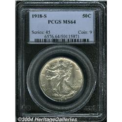 <B>1918-S<50C> MS64 PCGS.</B></I> Both sides of this, bright, satiny example are very well struck and there are numerous die striations in the obverse fields. A few light contact marks are confined to the central devices. A desirable example with a lot of eye appeal. <BR><BR><B>Important notice:</B> Heritage usually auctions material at the rate of 200-250 lots per hour. On some occasions eBay Live bid software or the Internet may not be able to keep up with the pace of the auction. We recommend placing a realistic absentee bid now as insurance to avoid disappointment. Occasionally the auctioneer may eliminate or reject an eBay Live bid, and the auctioneer may also reopen a lot after the close of the eBay live bidding (usually because we missed an audience bid), and may reject your bid even if it shows you as the winning bidder. By bidding via eBay Live, you agree that Heritage may award the lot to another bidder at its sole discretion under the circumstances described above or any other reasonable circumstances. Since eBay bids are not shown to us until we open the lot on the floor, we treat those bids just like floor bids. In most cases the floor responds before the eBay bid is presented to us, due to Internet lag time, so for consistency we have made it a policy that floor bids are always considered first over tie eBay live bids. Also please note that all Heritage lots purchased through eBay Live carry a 20% Buyer's Premium. Please make sure you read the Terms and Conditions before you bid.