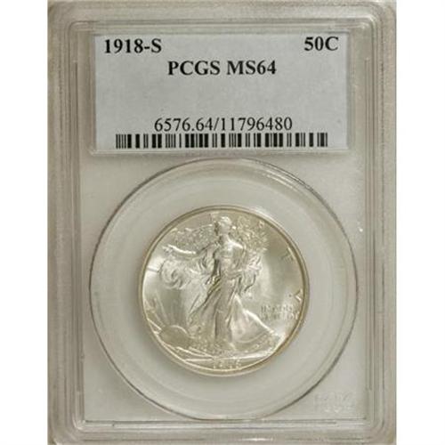 <B>1918-S 50C MS64 PCGS.</B></I> Swirling luster characterizes this attractive Choice example, one that displays above-average detail for the issue with a degree of definition on Liberty's hand and the flag. Subtle silver-gray patina graces the well-preserved fields, and only a few faint abrasions on Liberty's gown preclude a finer grade. All in all, a lovely example of this early Walker issue.<BR><BR><B>Coin Engraver:</B> Adolph A. Weinman<BR><BR><b>Shipping:</b> Coins & Currency (<a target="_blank" href="http://www.heritageauctions.com/common/shipping.php">view shipping information</a>\)
