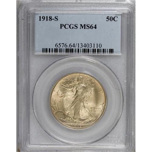 <B>1918-S 50C MS64 PCGS.</B></I> Consistent caramel-gold patina graces this pleasing Choice Walking Liberty half. The strike is suitable for an S-mint issue, with the expected merging of detail on the skirt lines, but both sides are impressive free from marks. PCGS has certified only 30 pieces finer (8/07).<BR><BR><B>Coin Engraver:</B> Adolph A. Weinman<BR><BR><b>Shipping:</b> Coins & Currency (<a target="_blank" href="http://www.heritageauctions.com/common/shipping.php">view shipping information</a>)