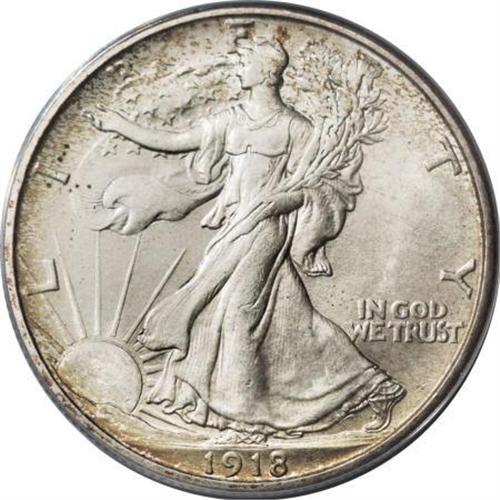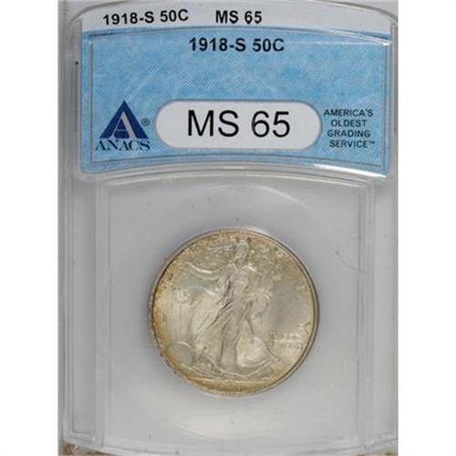 <B>1918-S 50C MS65 ANACS.</B></I> Both sides of this lustrous Gem have frosty ivory surfaces with rich peripheral gold toning confined to a portion of the obverse. It is surprisingly well detailed for an early issue that originated with the first design hub. While many of the skirt lines are nearly invisible, the thumb is strong, and the head details are sharp.<BR><BR><B>Coin Engraver:</B> Adolph A. Weinman<BR><BR><b>Shipping:</b> Coins & Currency (<a target="_blank" href="http://www.heritageauctions.com/common/shipping.php">view shipping information</a>)