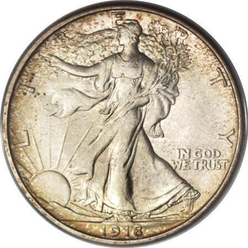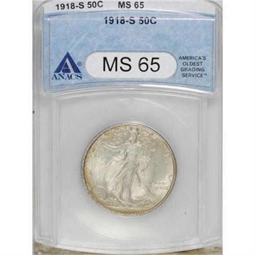 <B>1918-S 50C MS65 ANACS.</B></I> Assembling a collection of Gem Walking Liberty half dollars presents numerous challenges to the advanced collector. Many of the early dates are essentially unavailable in such high grades. While the 1918-S is obtainable, it ranks as a difficult issue in such fine quality. This lustrous Gem has a sharp strike for the issue, with nearly full thumb details and excellent head details. The skirt lines are weak as always on the pre-1921 dates. The ivory surfaces have soft, frosty mint luster with speckled peripheral gold toning on the obverse. The reverse is essentially untoned. <BR><BR><B>Coin Engraver:</B> Adolph A. Weinman<BR><BR><b>Shipping:</b> Coins & Currency (<a target="_blank" href="http://www.heritageauctions.com/common/shipping.php">view shipping information</a>)