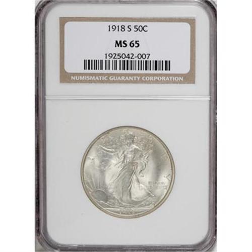 <B>1918-S 50C MS65 NGC.</B></I> A prized member of the Walking Liberty set, Gems of the 1918-S are hard to locate, and finer pieces are well-nigh impossible. Splendid surfaces display frosty white luster with subtle champagne toning near the peripheries. The strike is above average with Liberty's branch hand showing some details including a partial thumb. Skirt lines are typically weak, the result of improper design and not the pressure applied to this planchet by the coin press. The lines of the skirt on top of Liberty's leading leg are opposite the eagle's breast, aligning the deepest parts of the two dies. Experienced engravers understand that opposing relief is not desirable, a concept lost on artists with little engraving knowledge. Census: 34 in 65, 3 finer (6/07).<BR><BR><B>Coin Engraver:</B> Adolph A. Weinman<BR><BR><b>Shipping:</b> Coins & Currency (<a target="_blank" href="http://www.heritageauctions.com/common/shipping.php">view shipping information</a>\)