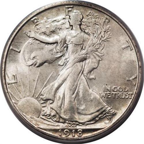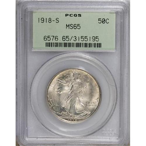 <B>1918-S 50C MS65 PCGS.</B></I> Mint State specimens of the 1918-S half dollar, with a mintage of 10.282 million pieces, are scarce. Moreover, the issue comes weakly struck, as alluded to by Bruce Fox in his Walking Liberty half dollar reference: "Liberty's hand, leg and the branches she holds tend to blend together as one entity."<BR> The Gem in this lot displays an above average strike. The area Fox refers to above, while not quite fully struck on this example, does exhibit sharp delineation. Both faces exude potent luster, and are lightly toned in pastels of sky-blue and gold-tan. A few unobtrusive obverse marks are totally consistent with the grade. Housed in a green-label holder. Population: 28 in 65, 2 finer (7/07).<BR><BR><B>Coin Engraver:</B> Adolph A. Weinman<BR><BR><b>Shipping:</b> Coins & Currency (<a target="_blank" href="http://www.heritageauctions.com/common/shipping.php">view shipping information</a>)