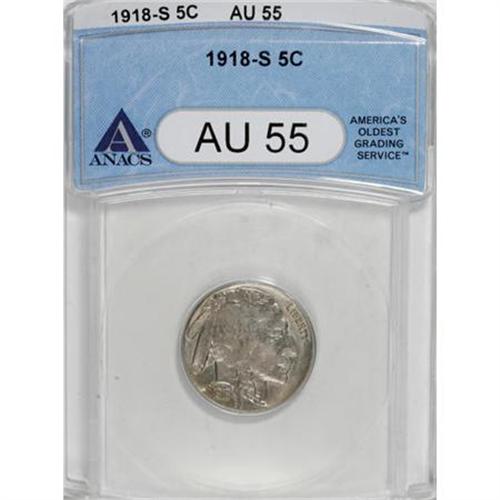<B>1918-S 5C AU55 ANACS.</B></I> NGC Census: (16/311). PCGS Population (31/463). Mintage: 4,882,000. Numismedia Wsl. Price for NGC/PCGS coin in AU55: $300. (#3940)<BR><BR><B>Coin Engraver:</B> James E. Fraser<BR><BR><b>Shipping:</b> Coins & Currency (<a target="_blank" href="http://www.heritageauctions.com/common/shipping.php">view shipping information</a>)