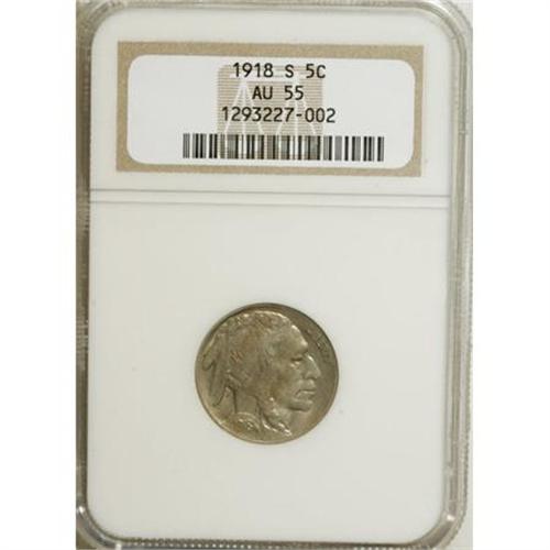 <B>1918-S 5C AU55 NGC.</B></I> NGC Census: (16/309). PCGS Population (31/422). Mintage: 4,882,000. Numismedia Wsl. Price for NGC/PCGS coin in AU55: $300. (#3940)<BR><BR><b>Shipping:</b> Coins & Currency (<a target="_blank" href="http://www.heritageauctions.com/common/shipping.php">view shipping information</a>)