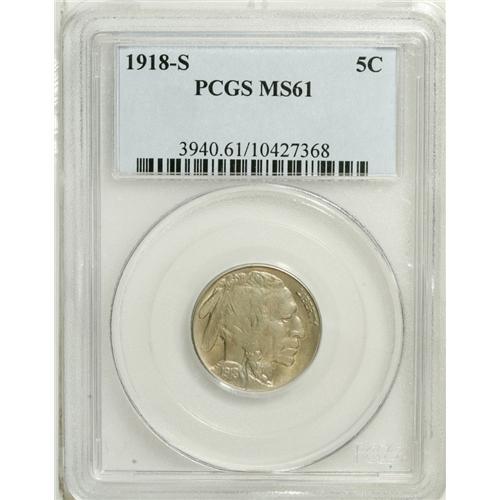 <B>1918-S 5C MS61 PCGS.</B></I> This luminous gray-gold example was softly struck from clashed dies. Clean overall, though a long, thin abrasion is noted on the bison's body.<BR><BR><b>Shipping:</b> Coin/Currency (<a target="_blank" href="http://www.heritageauctions.com/common/shipping.php">view shipping information</a>)