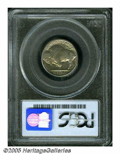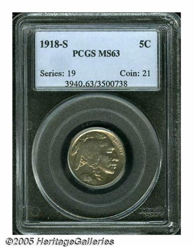 <B>1918-S<5C> MS63 PCGS.</B></I> The 1918-S is one of the genuinely scarce S-mint Buffalo nickel issues in Uncirculated grades, comparing favorably in rarity to all but the 1926-S, where it is only marginally edged out. Free of appreciable marks, this piece is well struck on the obverse, but very soft on the reverse. The lustrous surfaces have a slightly glossy texture, and there are a few scattered flyspecks on each side of the coin.