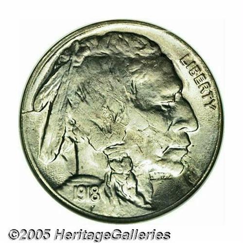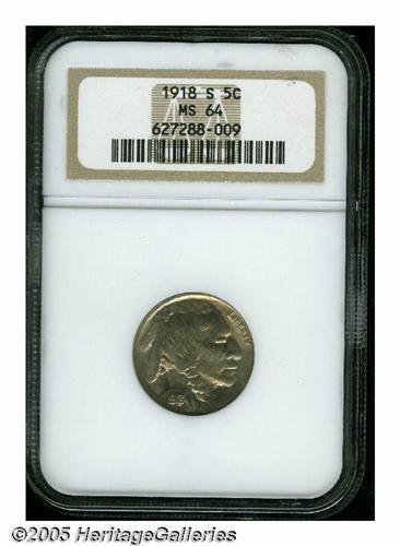 <B>1918-S<5C> MS64 NGC.</B></I> Original pastel-golden patina. Although the surfaces are essentially unabraded, the coin shows several planchet streaks and laminations diagonally across the obverse. Rather bold die clashing is also noted in the obverse fields. A scarce issue in high Mint State grades.