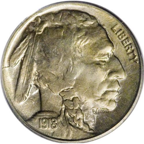 <B>1918-S 5C MS64 PCGS.</B></I> Among the most elusive semi-keys to the Buffalo nickel series in near-Gem and Gem condition, the 1918-S is a coin that appears frequently on collectors' want lists. The present example is extremely lustrous, with glints of gold and lilac on the highpoints. Considerable die fatigue and erosion are evident. On the obverse, it takes the form of die clash marks behind the Indian's neck and bold die cracks, one along the leftmost feather, a second from the tip of that feather to the rim. On the reverse, the die fatigue produces an orange-peel effect in the fields.<BR><BR><b>Shipping:</b> Coins & Currency (<a target="_blank" href="http://www.heritageauctions.com/common/shipping.php">view shipping information</a>)