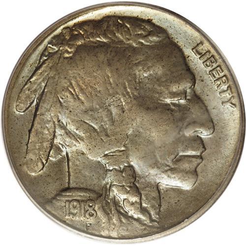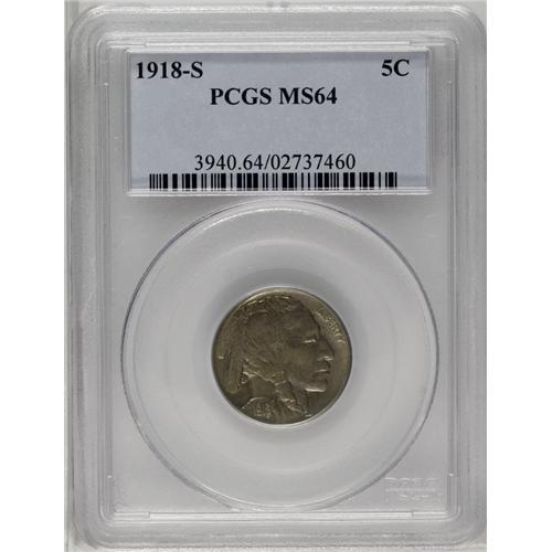 <B>1918-S<5C> MS64 PCGS.</B></I> Lustrous, with choice, original color in blue-gray, rose, and gold. The satiny luster is full and there are no contact marks discernible to the naked eye. Evidently, it was only the slightest weakness of strike at the braid and on the bison's shoulder that held PCGS back from granting this beautiful coin full Gem status. A scarce and important coin, especially with this much life and luster. Population: 160 in 64, 27 finer (2/06).