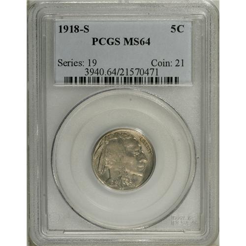 <B>1918-S 5C MS64 PCGS.</B></I> Nice luster exudes from both sides of this champagne-gray S-Mint product that is accented with whispers of powder-blue and beige. The 1918-S is usually weakly struck; the specimen offered here exhibits boldness on the date, LIBERTY, and the reverse lettering and mintmark. Typical softness is noted on the Indian's hair, as well as that on the bison.<BR><BR><b>Shipping:</b> Coin/Currency (<a target="_blank" href="http://www.heritageauctions.com/common/shipping.php">view shipping information</a>)