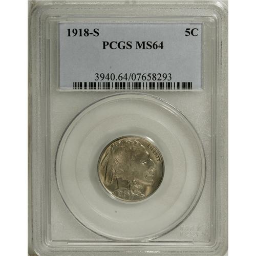<B>1918-S 5C MS64 PCGS.</B></I> One of the first of the truly difficult S-mint Buffalo nickels, and accordingly an issue whose price in Mint State has seen an extended runup the last few years. As such, the present near-Gem may represent excellent value for some forthright bidder. A bold date (often weak on this issue) and a decent strike, combined with good luster and attractive toning in lilac-gold and silver-gray, create much eye appeal and desirability. PCGS has certified only 29 examples finer (12/06).<BR><BR><b>Shipping:</b> Coin/Currency (<a target="_blank" href="http://www.heritageauctions.com/common/shipping.php">view shipping information</a>)