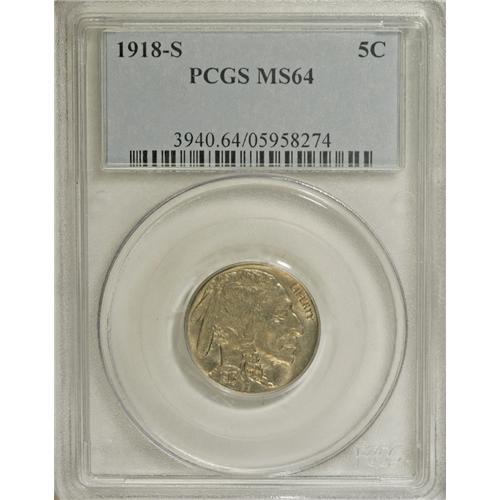 <B>1918-S 5C MS64 PCGS.</B></I> Sharply struck for an early branch mint issue, and neither side has any consequential marks. A satiny chestnut-gray near-Gem. E PLURIBUS UNUM is clashed beneath the Indian's chin, as often seen on this widely collected type. PCGS has encapsulated only 29 pieces finer (2/07).<BR><BR><b>Shipping:</b> Coins & Currency (<a target="_blank" href="http://www.heritageauctions.com/common/shipping.php">view shipping information</a>)