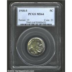 1918-S 5C MS64 PCGS. The date on this coin is exceptionally full for the issue: each digit is clear and crisp. On the other hand, the centers are a little soft. In the absence of bothersome abrasions and an excessive amount of carbon, however, the latter feature seems to be all that bars this coin from a full Gem grade. Intermingled swirls of gold and ice-blue iridescence blanket both sides, and there are also blushes of lilac tinting in select areas toward the peripheries. A rare coin in all Mint State grades, the 1918-S (4.8 million pieces produced) is particularly elusive in grades above the MS63 level. This issue is the worst struck of the three 1918-dated deliveries in the Buffalo Nickel series, and locating a high quality survivor with even average definition is a significant feat.From The BTB Collection of Buffalo Nickels. Important notice: We expect to be auctioning lots at the rate of 200-250 per hour. Sometimes eBay Premier live bid software cannot keep up with that pace, so we strongly recommend that you place a realistic proxy bid now as insurance to avoid disappointment. Also please note that all Heritage/CAA lots purchased through eBay Premier carry a 20% Buyer's Premium. Please make sure you read the Terms and Conditions.
