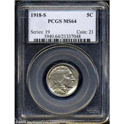 <table><tr><td><TABLE cellSpacing=0 cellPadding=0 width="100%" bgColor=#000000 border=0><TBODY> <TR><TD width="100%"><TABLE cellSpacing=1 cellPadding=3 width="100%" border=0><TBODY><TR><TD width="100%" bgColor=#79735c><FONT face=arial color=#ffffff size=3><B>Description</B> </FONT></TD></TR><TR><TD width="100%" bgColor=#ffffff><FONT face=arial size=2><B>1918-S 5C MS64 PCGS.</B></I> The 1918-S issue is one of the great condition rarities in the Buffalo nickel series. Although nearly five million pieces were minted, the vast majority entered circulation. Well struck, with astonishingly bold details for the type, especially near the peripheries, the current example is also highly lustrous and exquisitely preserved. There is a planchet streak (as struck) near the center of each side, but two or three minuscule contact marks per side seem to be the only post-striking impairments. Population: 112 in 64, 22 finer (9/03). </FONT></TD></TR></TBODY></TABLE></TD></TR></TBODY></TABLE><BR><A name=PricesRealized></A><TABLE cellSpacing=0 cellPadding=0 width="100%" bgColor=#000000 border=0><TBODY><TR><TD width="100%"><TABLE cellSpacing=1 cellPadding=3 width="100%" border=0><TBODY><TR><TD width="100%" bgColor=#79735c><A name=PR><FONT face=arial color=#ffffff size=3><B>Previous Prices from Heritage Auctions</B> </FONT></A></TD></TR><TR><TD bgColor=#f6f6ed><TABLE cellSpacing=0 cellPadding=0 width="100%" border=1><TBODY><TR><TD align=middle width="33%"><B>Date</B></TD><TD align=middle width="33%"><B>Service</B></TD><TD align=middle width="33%"><B>Price</B></TD></TR><TR bgColor=whitesmoke><TD width="33%"><B>09/20/2003</B></TD><TD width="33%">PCGS</TD><TD width="33%">$8,337.50</TD></TR><TR bgColor=whitesmoke><TD width="33%"><B>07/29/2003</B></TD><TD width="33%">PCGS</TD><TD width="33%">$5,750.00</TD></TR><TR bgColor=whitesmoke><TD width="33%"><B>07/29/2003</B></TD><TD width="33%">PCGS</TD><TD width="33%">$4,600.00</TD></TR><TR bgColor=whitesmoke><TD width="33%"><B>03/01/2003</B></TD><TD width="33%">PCGS</TD><TD width="33%">$5,520.00</TD></TR><TR bgColor=whitesmoke><TD width="33%"><B>01/11/2003</B></TD><TD width="33%">ANACS</TD><TD width="33%">$8,625.00</TD></TR><TR bgColor=whitesmoke><TD width="33%"><B>01/11/2003</B></TD><TD width="33%">PCGS</TD><TD width="33%">$16,100.00</TD></TR><TR bgColor=whitesmoke><TD width="33%"><B>09/28/2002</B></TD><TD width="33%">NGC</TD><TD width="33%">$3,680.00</TD></TR><TR bgColor=whitesmoke><TD width="33%"><B>07/30/2002</B></TD><TD width="33%">PCGS</TD><TD width="33%">$5,060.00</TD></TR><TR bgColor=whitesmoke><TD width="33%"><B>06/08/2002</B></TD><TD width="33%">PCGS</TD><TD width="33%">$7,475.00</TD></TR><TR bgColor=whitesmoke><TD width="33%"><B>10/06/2001</B></TD><TD width="33%">ANACS</TD><TD width="33%">$1,955.00</TD></TR><TR bgColor=whitesmoke><TD width="33%"><B>02/23/2001</B></TD><TD width="33%">NGC</TD><TD width="33%">$5,290.00</TD></TR><TR bgColor=whitesmoke><TD width="33%"><B>01/07/2000</B></TD><TD width="33%">PCGS</TD><TD width="33%">$5,405.00</TD></TR><TR bgColor=whitesmoke><TD width="33%"><B>02/12/1999</B></TD><TD width="33%">NGC</TD><TD width="33%">$2,300.00</TD></TR><TR bgColor=whitesmoke><TD width="33%"><B>08/02/1997</B></TD><TD width="33%">PCGS</TD><TD width="33%">$7,245.00</TD></TR><TR bgColor=whitesmoke><TD width="33%"><B>08/17/1996</B></TD><TD width="33%">NGC</TD><TD width="33%">$4,730.00</TD></TR><TR bgColor=whitesmoke><TD width="33%"><B>03/16/1996</B></TD><TD width="33%">PCGS</TD><TD width="33%">$4,180.00</TD></TR><TR bgColor=whitesmoke><TD width="33%"><B>01/06/1996</B></TD><TD width="33%">PCGS</TD><TD width="33%">$4,620.00</TD></TR><TR bgColor=whitesmoke><TD width="33%"><B>06/04/1995</B></TD><TD width="33%">NGC</TD><TD width="33%">$6,325.00</TD></TR><TR bgColor=whitesmoke><TD width="33%"><B>06/04/1995</B></TD><TD width="33%">NGC</TD><TD width="33%">$7,150.00</TD></TR><TR bgColor=whitesmoke><TD width="33%"><B>06/22/2000</B></TD><TD width="33%">PCGS</TD><TD width="33%">$5,175.00</TD></TR><TR bgColor=whitesmoke><TD width="33%"><B>06/22/2000</B></TD><TD width="33%">PCGS</TD><TD width="33%">$4,715.00</TD></TR><TR bgColor=whitesmoke><TD width="33%"><B>06/22/2000</B></TD><TD width="33%">PCGS</TD><TD width="33%">$4,830.00</TD></TR><TR bgColor=whitesmoke><TD width="33%"><B>05/27/2001</B></TD><TD width="33%">NGC</TD><TD width="33%">$3,450.00</TD></TR><TR bgColor=whitesmoke><TD width="33%"><B>10/01/2001</B></TD><TD width="33%">PCGS</TD><TD width="33%">$4,514.00</TD></TR><TR bgColor=whitesmoke><TD width="33%"><B>01/08/2002</B></TD><TD width="33%">ANACS</TD><TD width="33%">$2,760.00</TD></TR><TR bgColor=whitesmoke><TD width="33%"><B>05/01/1999</B></TD><TD width="33%">NGC</TD><TD width="33%">$4,025.00</TD></TR><TR bgColor=whitesmoke><TD width="33%"><B>01/01/1996</B></TD><TD width="33%">PCGS</TD><TD width="33%">$6,325.00</TD></TR><TR bgColor=whitesmoke><TD width="33%"><B>03/01/2000</B></TD><TD width="33%">PCGS</TD><TD width="33%">$3,795.00</TD></TR><TR bgColor=whitesmoke><TD width="33%"><B>08/01/1999</B></TD><TD width="33%">PCGS</TD><TD width="33%">$3,565.00</TD></TR><TR bgColor=whitesmoke><TD width="33%"><B>05/01/1999</B></TD><TD width="33%">PCGS</TD><TD width="33%">$4,235.00</TD></TR></TBODY></TABLE></TD></TR><TR><TD bgColor=#ffffff><FONT face=arial size=1 ?>PLEASE NOTE: All prices realized reflect the final hammer price PLUS the buyer's premium in auctions that charge a buyer's premium. Each item has a notation at the top of the listing indicating whether that lot included a buyer's premium. Example: A item that sells with a final hammer price of $100 and a 20% buyer's premium will display with a price realized of $120. All information listed is intended to be as accurate as possible, but errors are possible. Please use this guide carefully and inform us of any inaccuracies. </FONT></TD></TR></TBODY></TABLE></TD></TR></TBODY></TABLE><BR><TABLE cellSpacing=0 cellPadding=0 width="100%" bgColor=#000000 border=0><TBODY><TR><TD width="100%"><TABLE cellSpacing=1 cellPadding=3