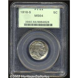 1918-S 5C MS64 PCGS. One of the genuinely scarce S-mint Buffalo nickel issues in Uncirculated grades, comparing favorably in rarity to all but the 1926-S, where it is only marginally edged out. Both sides of this high grade example exhibit thick satiny luster, with appealing variegated pastel colors, and would be deserving of Gem status if just a bit sharper on the central details. No distractions are evident on either side of the coin. Population: 124 in 64, 23 finer (10/03). Important notice: Heritage usually auctions material at the rate of 200-250 lots per hour. On some occasions eBay Live bid software or the Internet may not be able to keep up with the pace of the auction. We recommend placing a realistic absentee bid now as insurance to avoid disappointment. Occasionally the auctioneer may eliminate or reject an eBay Live bid, and the auctioneer may also reopen a lot after the close of the eBay live bidding (usually because we missed an audience bid), and may reject your bid even if it shows you as the winning bidder. By bidding via eBay Live, you agree that Heritage may award the lot to another bidder at its sole discretion under the circumstances described above or any other reasonable circumstances. Also please note that all Heritage lots purchased through eBay Live carry a 20% Buyer's Premium. Please make sure you read the Terms and Conditions before you bid.