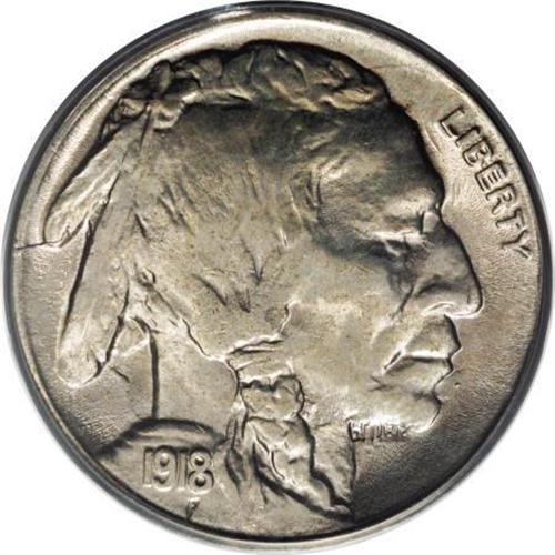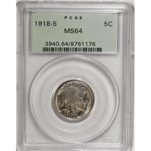 <B>1918-S 5C MS64 PCGS.</B></I> An elusive early branch mint issue in lustrous Choice Mint State. Sharply struck save for the customary softness on the hair above the braid. The mintmark is distinct. Light gold and olive toning aids the eye appeal. Several letters in PLURIBUS are legible beneath the chin, due to clashed dies. Housed in a green label holder.<BR><BR><B>Coin Engraver:</B> James E. Fraser<BR><BR><b>Shipping:</b> Coins & Currency (<a target="_blank" href="http://www.heritageauctions.com/common/shipping.php">view shipping information</a>)