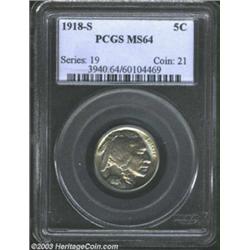 <TABLE cellSpacing=0 cellPadding=0 width="100%" bgColor=#000000 border=0><TBODY><TR><TD width="100%"><TABLE cellSpacing=1 cellPadding=3 width="100%" border=0><TBODY><TR><TD width="100%" bgColor=#79735c><FONT face=arial color=#ffffff size=3><B>Description</B> </FONT></TD></TR><TR><TD width="100%" bgColor=#ffffff><FONT face=arial size=2><B>1918-S 5C MS64 PCGS.</B></I> The rarity, and consequently the price, of this S-mint issue increases rapidly as one approaches the Gem level of preservation. Any striking deficiencies that this near-Gem displays are more than offset by the gorgeous apricot-gold and lilac-blue patina that overlays both sides in a somewhat target-like fashion and by its outstanding luster. </FONT></TD></TR></TBODY></TABLE></TD></TR></TBODY></TABLE><BR><A name=PricesRealized></A><TABLE cellSpacing=0 cellPadding=0 width="100%" bgColor=#000000 border=0><TBODY><TR><TD width="100%"><TABLE cellSpacing=1 cellPadding=3 width="100%" border=0><TBODY><TR><TD width="100%" bgColor=#79735c><A name=PR><FONT face=arial color=#ffffff size=3><B>Previous Prices from Heritage Auctions</B> </FONT></A></TD></TR><TR><TD bgColor=#f6f6ed><TABLE cellSpacing=0 cellPadding=0 width="100%" border=1><TBODY><TR><TD align=middle width="33%"><B>Date</B></TD><TD align=middle width="33%"><B>Service</B></TD><TD align=middle width="33%"><B>Price</B></TD></TR><TR bgColor=whitesmoke><TD width="33%"><B>01/07/2000</B></TD><TD width="33%">PCGS</TD><TD width="33%">$5,405.00</TD></TR><TR bgColor=whitesmoke><TD width="33%"><B>08/02/1997</B></TD><TD width="33%">PCGS</TD><TD width="33%">$7,245.00</TD></TR><TR bgColor=whitesmoke><TD width="33%"><B>01/06/1996</B></TD><TD width="33%">PCGS</TD><TD width="33%">$4,620.00</TD></TR><TR bgColor=whitesmoke><TD width="33%"><B>03/16/1996</B></TD><TD width="33%">PCGS</TD><TD width="33%">$4,180.00</TD></TR><TR bgColor=whitesmoke><TD width="33%"><B>01/01/1996</B></TD><TD width="33%">PCGS</TD><TD width="33%">$6,325.00</TD></TR><TR bgColor=whitesmoke><TD width="33%"><B>03/01/2000</B></TD><TD width="33%">PCGS</TD><TD width="33%">$3,795.00</TD></TR><TR bgColor=whitesmoke><TD width="33%"><B>08/01/1999</B></TD><TD width="33%">PCGS</TD><TD width="33%">$3,565.00</TD></TR><TR bgColor=whitesmoke><TD width="33%"><B>05/01/1999</B></TD><TD width="33%">PCGS</TD><TD width="33%">$4,235.00</TD></TR><TR bgColor=whitesmoke><TD width="33%"><B>09/28/2002</B></TD><TD width="33%">NGC</TD><TD width="33%">$3,680.00</TD></TR><TR bgColor=whitesmoke><TD width="33%"><B>05/27/2001</B></TD><TD width="33%">NGC</TD><TD width="33%">$3,450.00</TD></TR><TR bgColor=whitesmoke><TD width="33%"><B>02/23/2001</B></TD><TD width="33%">NGC</TD><TD width="33%">$5,290.00</TD></TR><TR bgColor=whitesmoke><TD width="33%"><B>06/04/1995</B></TD><TD width="33%">NGC</TD><TD width="33%">$6,325.00</TD></TR><TR bgColor=whitesmoke><TD width="33%"><B>02/12/1999</B></TD><TD width="33%">NGC</TD><TD width="33%">$2,300.00</TD></TR><TR bgColor=whitesmoke><TD width="33%"><B>08/17/1996</B></TD><TD width="33%">NGC</TD><TD width="33%">$4,730.00</TD></TR><TR bgColor=whitesmoke><TD width="33%"><B>06/04/1995</B></TD><TD width="33%">NGC</TD><TD width="33%">$7,150.00</TD></TR><TR bgColor=whitesmoke><TD width="33%"><B>05/01/1999</B></TD><TD width="33%">NGC</TD><TD width="33%">$4,025.00</TD></TR><TR bgColor=whitesmoke><TD width="33%"><B>01/11/2003</B></TD><TD width="33%">ANACS</TD><TD width="33%">$8,625.00</TD></TR><TR bgColor=whitesmoke><TD width="33%"><B>03/01/2003</B></TD><TD width="33%">PCGS</TD><TD width="33%">$5,520.00</TD></TR><TR bgColor=whitesmoke><TD width="33%"><B>07/29/2003</B></TD><TD width="33%">PCGS</TD><TD width="33%">$5,750.00</TD></TR><TR bgColor=whitesmoke><TD width="33%"><B>07/29/2003</B></TD><TD width="33%">PCGS</TD><TD width="33%">$4,600.00</TD></TR><TR bgColor=whitesmoke><TD width="33%"><B>01/11/2003</B></TD><TD width="33%">PCGS</TD><TD width="33%">$16,100.00</TD></TR><TR bgColor=whitesmoke><TD width="33%"><B>06/22/2000</B></TD><TD width="33%">PCGS</TD><TD width="33%">$5,175.00</TD></TR><TR bgColor=whitesmoke><TD width="33%"><B>06/22/2000</B></TD><TD width="33%">PCGS</TD><TD width="33%">$4,715.00</TD></TR><TR bgColor=whitesmoke><TD width="33%"><B>06/22/2000</B></TD><TD width="33%">PCGS</TD><TD width="33%">$4,830.00</TD></TR><TR bgColor=whitesmoke><TD width="33%"><B>10/01/2001</B></TD><TD width="33%">PCGS</TD><TD width="33%">$4,514.00</TD></TR><TR bgColor=whitesmoke><TD width="33%"><B>07/30/2002</B></TD><TD width="33%">PCGS</TD><TD width="33%">$5,060.00</TD></TR><TR bgColor=whitesmoke><TD width="33%"><B>06/08/2002</B></TD><TD width="33%">PCGS</TD><TD width="33%">$7,475.00</TD></TR><TR bgColor=whitesmoke><TD width="33%"><B>01/08/2002</B></TD><TD width="33%">ANACS</TD><TD width="33%">$2,760.00</TD></TR><TR bgColor=whitesmoke><TD width="33%"><B>10/06/2001</B></TD><TD width="33%">ANACS</TD><TD width="33%">$1,955.00</TD></TR></TBODY></TABLE></TD></TR><TR><TD bgColor=#ffffff><FONT face=arial size=1 ?>PLEASE NOTE: All prices realized reflect the final hammer price PLUS the buyer's premium in auctions that charge a buyer's premium. Each item has a notation at the top of the listing indicating whether that lot included a buyer's premium. Example: A item that sells with a final hammer price of $100 and a 20% buyer's premium will display with a price realized of $120. All information listed is intended to be as accurate as possible, but errors are possible. Please use this guide carefully and inform us of any inaccuracies. </FONT></TD></TR></TBODY></TABLE></TD></TR></TBODY></TABLE><BR><TABLE cellSpacing=0 cellPadding=0 width="100%" bgColor=#000000 border=0><TBODY><TR><TD width="100%"><TABLE cellSpacing=1 cellPadding=3 width="100%" border=0><TBODY><TR><TD width="100%" bgColor=#79735c colSpan=6><FONT face=arial color=#ffffff size=3><B>Price Guide*</B> </FONT></TD></TR><TR bgColor=#f6f6ed><TD align=middle><B>Grade</B> </TD><TD align=middle><B>Coin World<BR>(Trends)</B> </TD><TD align=middle><B>Numismedia<BR>Retail</B> </TD><TD align=middle><B>Numisme