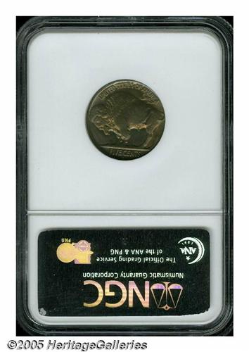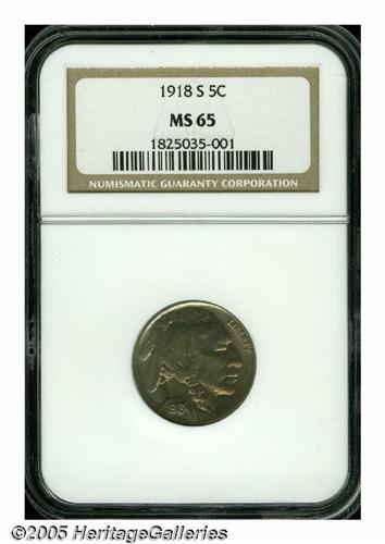 <B>1918-S<5C> MS65 NGC.</B></I> The 1918-S is one of the scarcest and most under appreciated issues in the Buffalo Nickel series in MS65 condition, with Mint State survivors often being disqualified from the Gem ranks due to striking deficiencies. Although shy of fully detailed, this exceptional representative easily atones with silky smooth, lustrous surfaces and an attractive coating of orange-gold and steel-blue toning. Among the nicest '18-S Nickels we have ever offered. Population: 10 in 65, 0 finer (6/05).