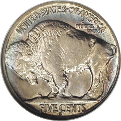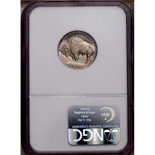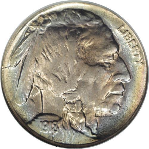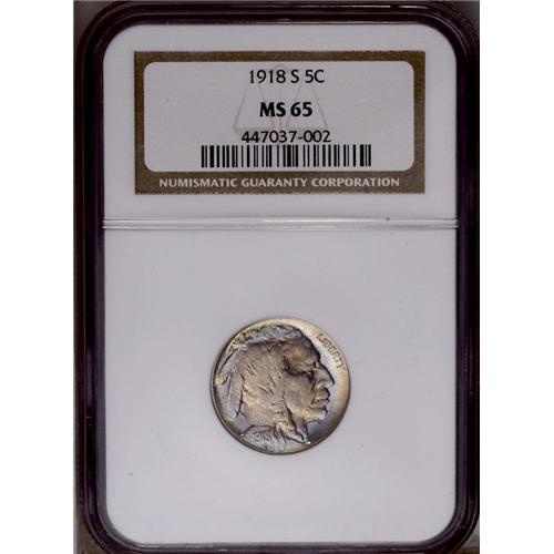 <B>1918-S<5C> MS65 NGC.</B></I> This impressive Gem is tied for the finest certified by NGC. The 1918-S Buffalo nickel is one of the hardest dates in the entire series to find in Gem MS65 or finer condition, despite a substantial mintage of nearly 5 million coins. Nearly every example is weakly defined, and almost the entire mintage entered circulation, where even a little wear would give the coin a middle grade circulated appearance. Those few that did survive without any evidence of circulation are still apt to grade only in the MS60 to MS63 range.<BR> The obverse of this Gem example has light gold toning at the center, and it is encircled by rings of pale blue and light yellow toning near the border. Although the central details show evidence of design weakness, most design elements are quite nicely defined. Along the upper right border, LIBERTY is sharp and clearly separated from the rim, although magnification reveals that the letters have a vestigial appearance. The obverse has minor clash marks in the usual location and a die crack from the border at 9 o'clock to the feather tip. The reverse coloration is similar to the obverse with pale gold framed by light blue and yellow at the border, especially above the bison. Like the obverse, the central reverse details are somewhat weak, but the overall design detail is clearly sharper than usual. Census: 9 in 65, 0 finer (4/06).