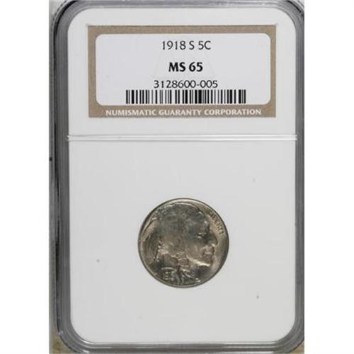 <B>1918-S 5C MS65 NGC.</B></I> The 1918-S nickel is well known to the legions of Buffalo nickel aficionados as one of the major mintmarked rarities of the series, one that is challenging both in terms of condition and strike. This is a simply marvelous specimen that exhibits glowing luster, partially a function of the orange-peel effect in the fields from die fatigue. The strike is nonetheless sharp, with good articulation on the date, the Indian's braid, the bison's shoulder, and the horn. The obverse shows bold die clashing, the obverse in the form of a "goatee" under the Indian's chin from IN GOD WE TRUST, as often seen in the series, and behind the Indian's neck. The surfaces show golden-gray predominating, with tinges of blue and pink in the recesses. Census: 11 in 65, 1 finer (3/08).<BR><BR><B>Coin Engraver:</B> James E. Fraser<BR><BR><b>Shipping:</b> Coins & Currency (<a target="_blank" href="http://www.heritageauctions.com/common/shipping.php">view shipping information</a>)
