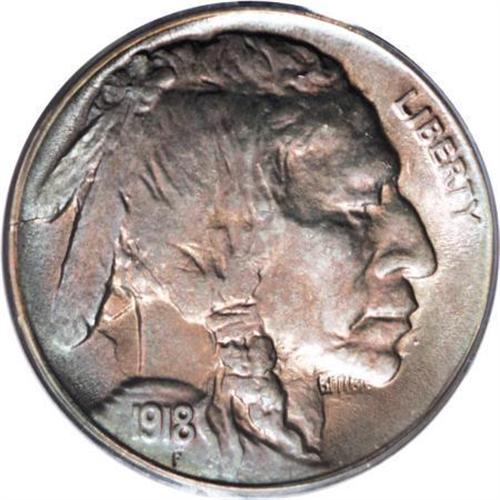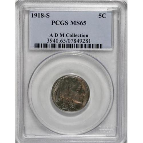 <B>1918-S 5C MS65 PCGS.</B></I> Ex: ADM Collection. The 1918-S has long been recognized as one of the most challenging issues in the early Buffalo nickel series. Some of the problem is absolute rarity, as coins grading VF or better are scarce. But even when high grade pieces are found, the striking details are often soft. This is not necessarily because the striking pressure was weak, but as David Lange points out in the third edition of his book on this series: "In some instances the dies were set too far apart to make a complete impression. This was done as an economy measure to reduce wear on both the dies and press and to thus extend their useful life." This particular coin is better struck than most, but of course, it still lacks complete highpoint definition above the knot in the braid. The reverse details are exceptionally sharp over the bison's head and tail. This is also a beautifully toned coin that shows rich rose centers and a slight accent of blue around the margins. Population: 29 in 65, 1 finer (8/07).<BR><BR><B>Coin Engraver:</B> James E. Fraser<BR><BR><b>Shipping:</b> Coins & Currency (<a target="_blank" href="http://www.heritageauctions.com/common/shipping.php">view shipping information</a>)
