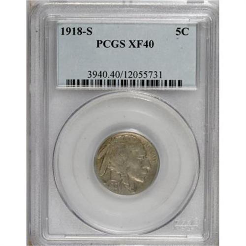 <B>1918-S 5C XF40 PCGS.</B></I> PCGS Population (11/543). NGC Census: (5/344). Mintage: 4,882,000. Numismedia Wsl. Price for NGC/PCGS coin in XF40: $146. (#3940)<BR><BR><B>Coin Engraver:</B> James E. Fraser<BR><BR><b>Shipping:</b> Coins & Currency (<a target="_blank" href="http://www.heritageauctions.com/common/shipping.php">view shipping information</a>)