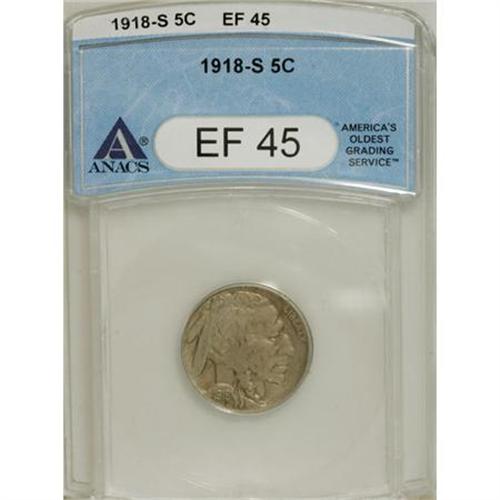 <B>1918-S 5C XF45 ANACS.</B></I> NGC Census: (9/335). PCGS Population (17/518). Mintage: 4,882,000. Numismedia Wsl. Price for NGC/PCGS coin in XF45: $182. (#3940)<BR><BR><B>Coin Engraver:</B> James E. Fraser<BR><BR><b>Shipping:</b> Coins & Currency (<a target="_blank" href="http://www.heritageauctions.com/common/shipping.php">view shipping information</a>)